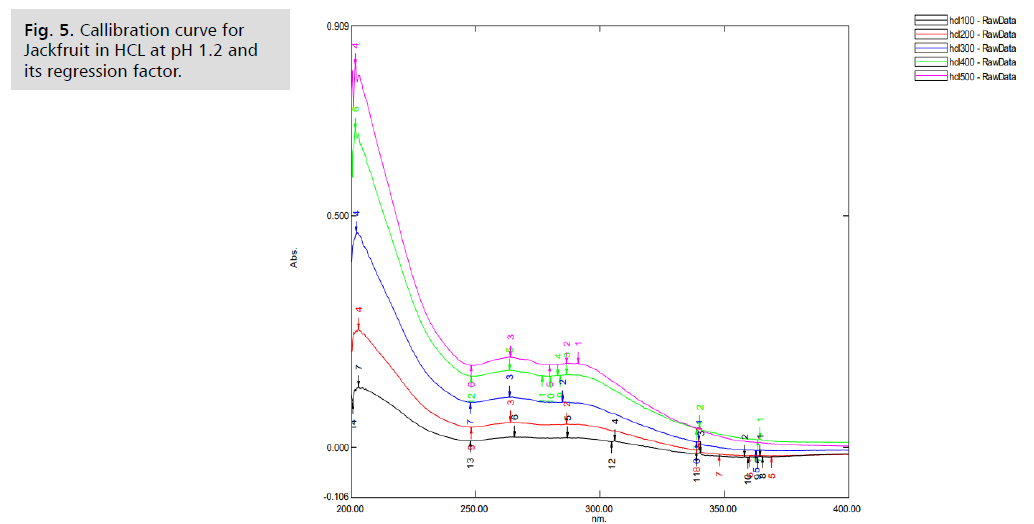 The spectroscopy of photons in the UV-visible range is connected to ultraviolet-visible spectrophotometry, or UVVis. The visible spectrum or its nearby wavelengths are used in UV-visible spectroscopy. The absorption in the visible ranges is directly influenced by the color of the substances involved. In various portions of the electromagnetic spectrum, molecules go through electronic transitions. The spectrometer automatically scans each of the component wavelengths during a brief period. The visible section is often between 400 and 800 nm, whereas the ultraviolet (UV) region is typically between 200 and 400 nm. A 100 ml volumetric flask containing 100 ml of methanol was used to provide 100 μg of the Artocarpus heterophyllus' methanolic extract. The solution's concentration was then 1000 μg/ml [6]. Further dilution was performed at volumes of 1 ml, 2 ml, 3 ml, 4 ml, and 5 ml, giving concentrations of 100 μg/ml, 200 μg/ml, 300 μg/ml, 400 μg/ml, and 500 μg/ml, respectively. The extract was then scanned in the UV-Visible spectrophotometer between 200 nm and 400 nm. The wavelength of the Lambda UV spectrometer (Shimadzu, Japan) was adjusted in order to determine the value of max, and the maximum absorbance was calibrated using different blanks for each extract. After inserting each sample solution, a wavelength between 400 and 200 nm was passed. It was noted what wavelength the absorption was at its highest. The maximum is shown on a plot of absorbance vs wavelength. The scanning graph and associated absorbance values were recorded. The regression factor for jackfruit in hcl ph. 1.2 was found to be 0.984 [7] (Fig. 5.).